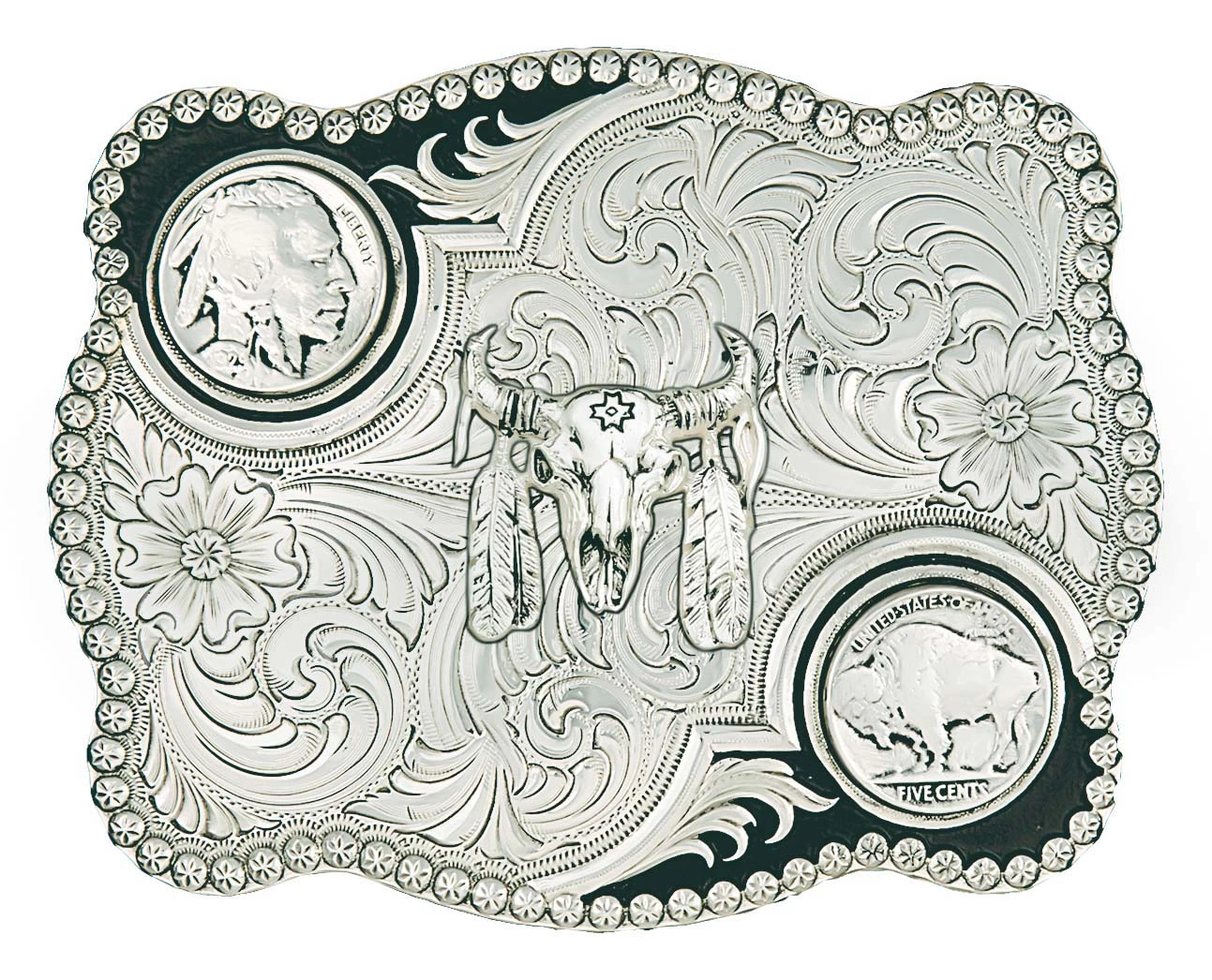 This darkly antiqued, medium sized scallop shape belt buckle features two vintage buffalo nickels in opposite corners of fully engraved traditional western bright cut style scrolls. Framed around the edge with etched berry trim. The figure of a ceremonial buffalo skull is applied to the center. 2 inch belt swivel.