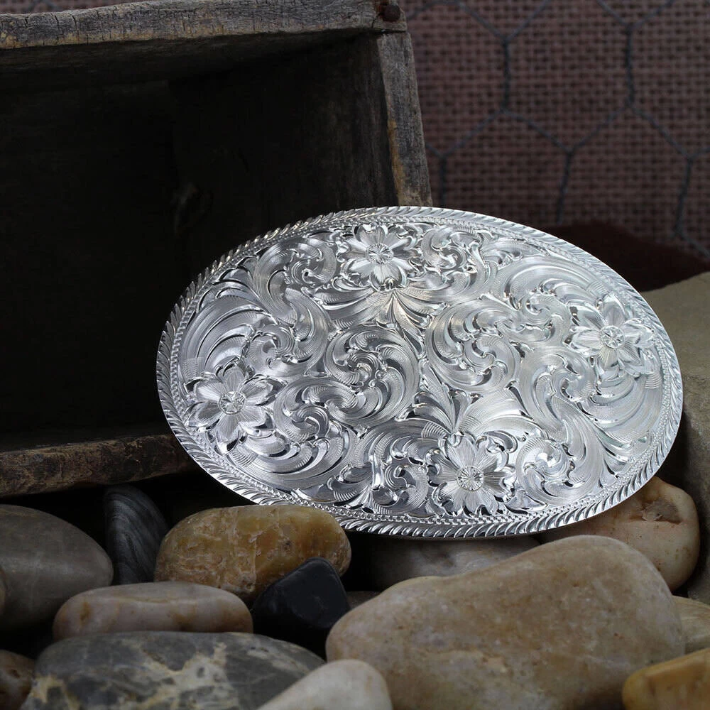 Both understated and strikingly beautiful, there is a reason our authentic fully engraved western style silver belt buckles remain best sellers throughout the years. This small, oval shape fully engraved silver buckle shows the Montana Silversmiths artisans talents beautifully with finely engraved with traditional western filigree and edged with bright cuts to reflect light and show the brilliance of this silver buckle. 2 inch belt swivel. Can also be custom ordered with a gold figure.